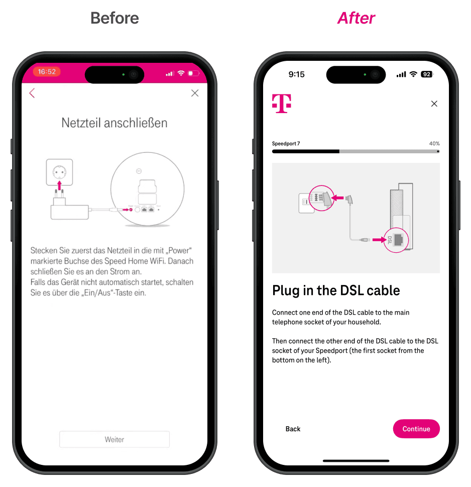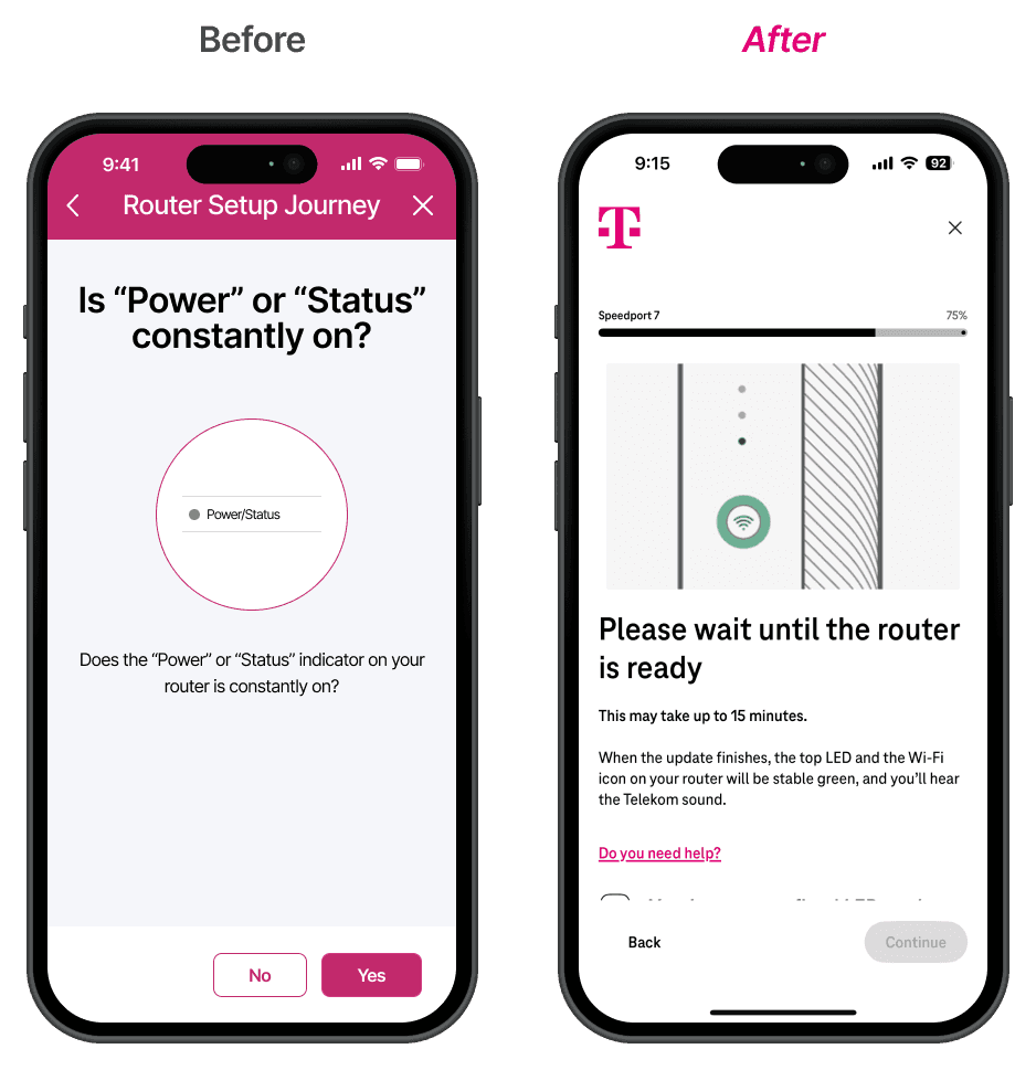 After: Removes the question entirely. Instead, the app takes ownership of the waiting state — it tells users what to expect (LED behavior, Telekom sound, up to 15 min). This shifts from user-as-troubleshooter to app-as-guide.