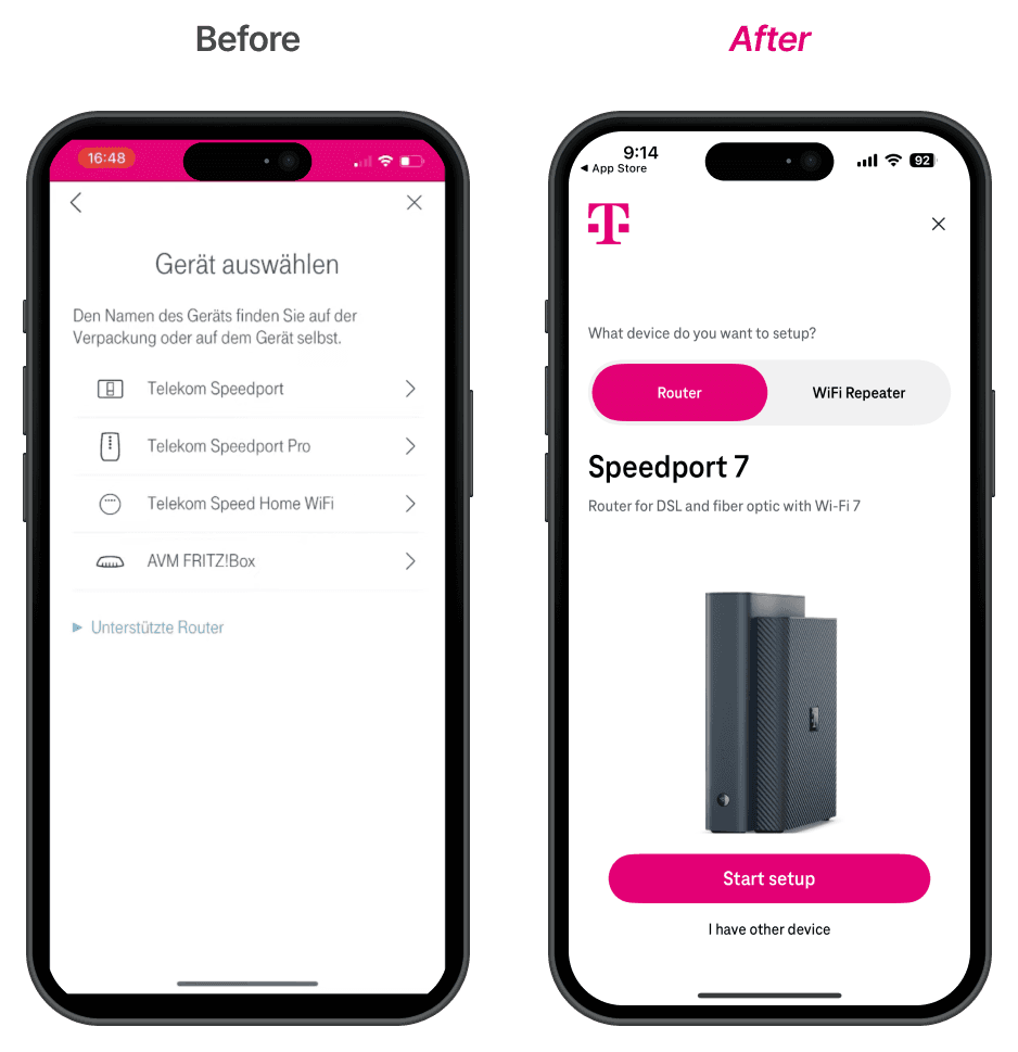 Redesigning Telekom's router setup flow to reduce cognitive load, set clearer expectations, and guide users through hardware onboarding with less friction.